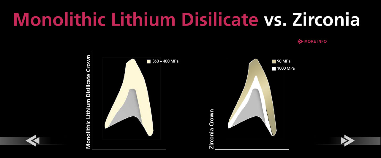 Several internal Ivoclar Vivadent tests have demonstrated that the monolithic lithium disilicate is incredibly durable and that the zirconia veneered restorations fail with less load and fewer chewing cycles.